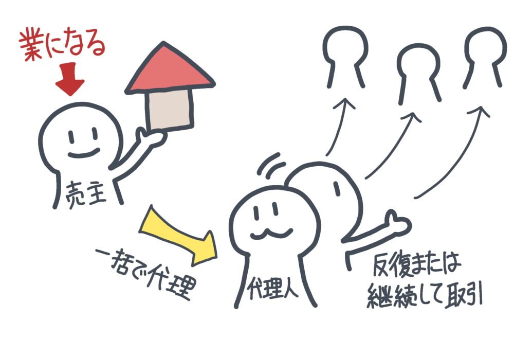 例え一括で代理(媒介)の依頼をしても、代理人(媒介人)が不特定かつ多数を相手に反復または継続して契約を結んだ場合は、依頼をした人も業にあたるからです。